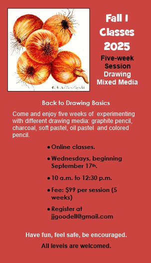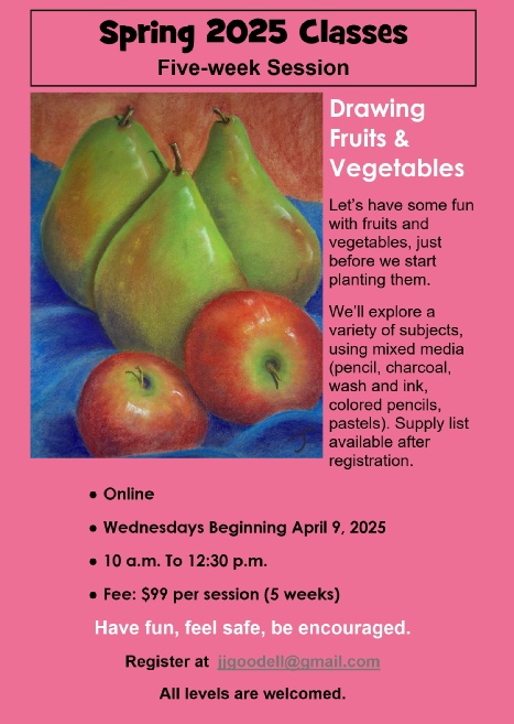 These are student-driven classes. That means you, the student, tell me what you want to learn. We cover a lot of different media. This session we will experiment with mixed media: graphite pencil, charcoal, soft or oil pastel and colored pencil.